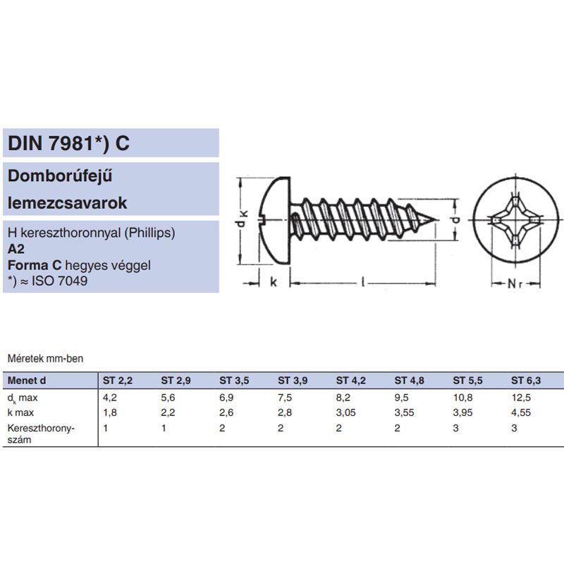 CSAVAR, KÖTŐELEM LEMEZCSAVAR DOMBORÚFEJŰ KERESZTHORNYÚ - LEMEZCSAVAR DFKH D5.5*45 DIN 7981 A2 INOX PH